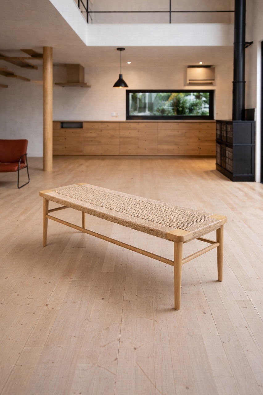 ペーパーコードのベンチはその独自の素材感とデザイン性から大変人気があります。モダンでエレガントなインテリアにマッチします。また、手作り感や自然素材の温もりを感じられるので、心地よい空間を演出することができます。